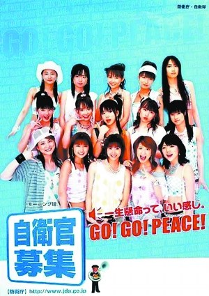 此外,日本自卫队还精心推出了一套征兵海报,其主角是日本流行的美少女组合。十多个青春靓丽,穿着“清凉”的少女,呼唤着“前进,前进,为了和平!”确实对于动漫和流行音乐熏陶下成长起来的日本新一代有着别样的吸引力。