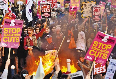 英国首相卡梅伦半年前上任时,曾许诺开辟“共识政治”的新纪元,但一场学生暴力示威标志着英国联盟政府“共识期”的结束。这也是20年来最暴力的街头示威活动。据报道,部分示威者轻易突破警方防线,冲进6层高的总部大楼,击破接待处的玻璃墙,肆意毁坏大堂家具,用喷漆写上“保守党废物”等字句。有人直奔顶楼,从高处向地面人群掷下灭火器、水瓶等。