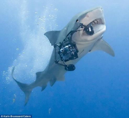 据报道,这条虎鲨在“犯案”之前还很“配合”,摆出各种姿势供摄影师取镜。不过,它突然张开血盆大口,冲过来叼走了相机,令摄影师大吃一惊。