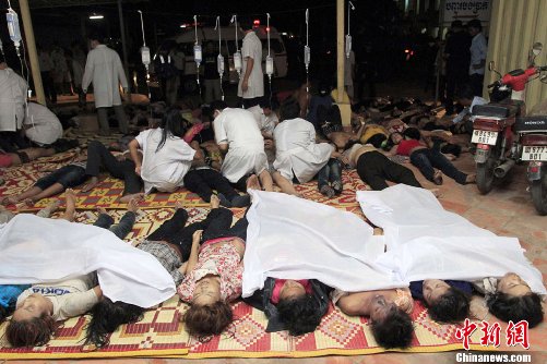 由于游人太多,金边市区连接钻石岛一座狭窄的桥发生晃动,引起桥上人群的恐慌,两边人群互相推挤踩踏,导致了惨剧,不少人情急之下跳进河中才得以生还,有幸存者表示,自己在混乱中跌倒后被人拉起来,才幸免于难。