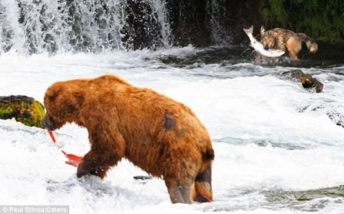 斯汀萨说,他从来没见过狼会下河抓鱼。以前的狼只会拣熊吃剩下的鱼骨头啃啃,但现在这匹狼无论是抓鱼的技巧还是速度,实际上比熊还要更好和更快。