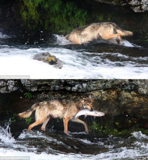 斯汀萨形容说,这匹狼小心地踮着脚走路,直到瀑布顶端的池边,瞄准水中的鲑鱼后,才头朝下潜入水中,捕捉到了一条鱼,用嘴紧紧咬住,鱼还在狼嘴中挣扎。这匹狼不断实践,技巧越来越纯熟,不一会儿时间给自己抓到了15条鱼,可谓是“大丰收”。狼把鱼一条条都藏到了附近的灌木丛里。