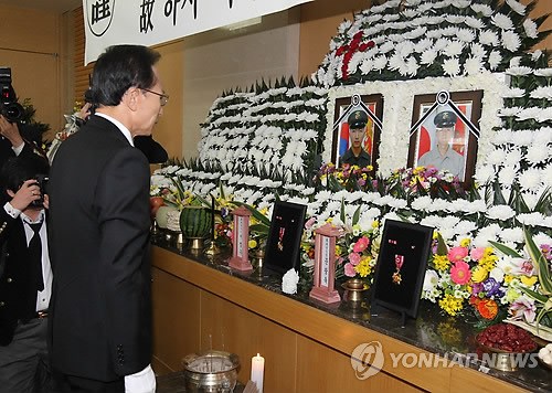 中新网11月26日电 据韩联社报道,26日,韩国李明博总统前往国军首都医院,到在延坪岛炮击中死亡的士兵徐庭午和文光旭(音译)的灵堂吊唁。