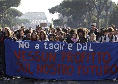 中新网11月26日电 据外电报道,数千名意大利学生25日在罗马竞技场和比萨斜塔等地举行抗议示威,反对贝卢斯科尼政府的削减预算和大学改革提议。