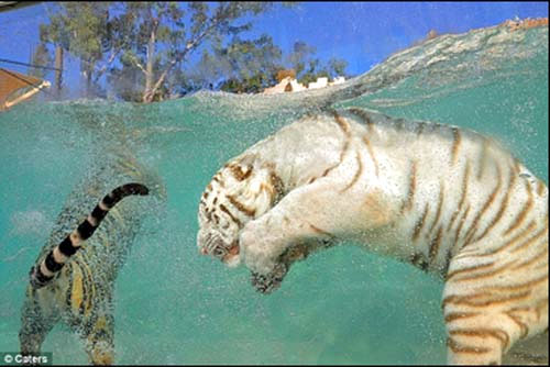 中新网12月3日电 据台湾“今日新闻网”3日报道,一般猫咪给人的印象都是不太喜欢玩水的,但在这组照片中,俗称“大猫”的两只老虎则是在美国加州的游泳池中开心地玩乐,甚至为了争夺训练师丢入水中的肉块,不惜闭着眼睛也要潜入泳池,展开一场你追我跑的戏水游戏。据了解,这场老虎戏水秀已成为动物园中最受欢迎的表演之一了。