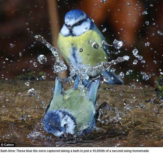 这名摄影师是金泰勒(Kim Taylor),现年77岁的他是前政府生物学家,现在则常拍摄鸟类的照片。日前,他在萨里郡(Surrey)的住家厨房窗户旁,直击一群蓝山雀集体在花园水塘内冲澡。