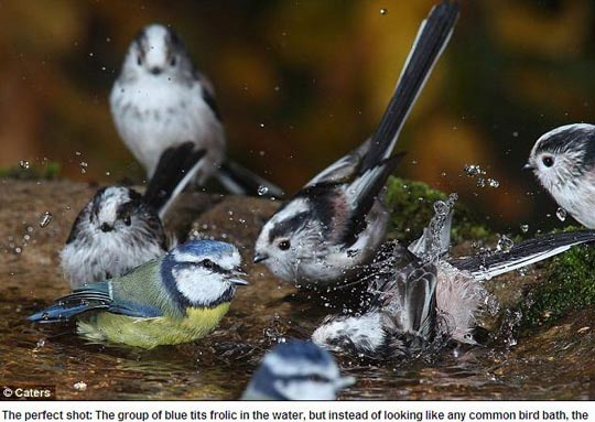 中新网12月7日电 据台湾“今日新闻网”7日报道,不止人类每天要洗澡,连鸟类也有沐浴的习惯。英国一名摄影师就捕捉到一群蓝山雀(blue tit)在傍晚时分,集体欢乐地在花园水池中冲凉。