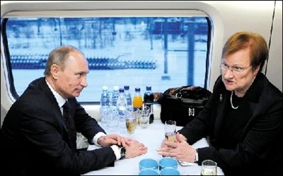 俄罗斯与芬兰之间首条高速铁路12日正式开通,俄罗斯总理弗拉基米尔·普京和芬兰总统塔里娅·哈洛宁共同乘坐首班列车。普京在下车后开玩笑说,由于车速过快,他和哈洛宁都没有足够时间交谈。这条铁路是连接俄罗斯和欧洲其他国家的首条高铁。