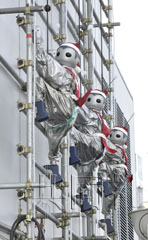 中新网12月15日电 据日本共同社网站报道,曾在上海世博会日本产业馆攀爬墙壁的3个人气机器人“梦ROBO”装扮成圣诞老人的模样,15日开始在大阪市中央区的“京阪大厦”外壁上表演升降爬行。