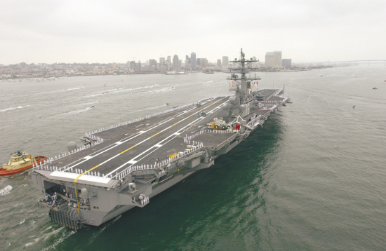 它是美国“尼米兹”级核动力航空母舰的九号舰,2001年完工下水,2003年正式服役。这艘航母造价高达45亿美元,每天运转花费100万美元。“里根号”航母舰长333米,可载80架舰载飞机,装有两座核反应堆,可供“里根号”航行20年,完全不需要靠岸加油,而设计服役期长达50年。“里根号”里能住下6000多人,船上储备的食物和供给可以维持他们三个月的生活。