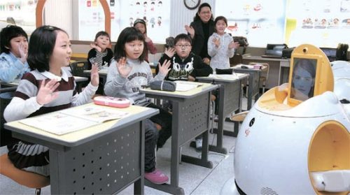据报道,在韩国大邱市鹤亭洞鹤亭小学的“英语区”,机器人“EngKe”(English和Key的合成词)负责教授孩子们英语。一名小学三年级的男同学说,“同机器人一起上课更有趣,学习也非常有意思。”