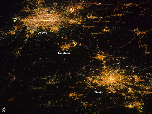 照片中,位于北京和天津之间的廊坊市以及华北平原东北部几个规模更小的开发区的“夜景轮廓”同样清晰可见,图中没有亮光的区域主要是农田。当地主要农作物为小麦和玉米。由于图片中城市照明分布清晰,表明该地区当时天气状况良好。