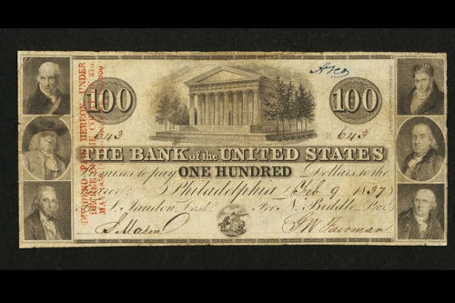 美国建国之初最接近央行的机构是美国第一银行,最早是由汉密尔顿(Alexander Hamilton)提议设立的。第一个特许经营期是从1791年至1811年,而美国第二银行的特许经营期从1816年至1836年。在20年的特许经营期到期后,美国第一银行在宾夕法尼亚州获得了州特许经营许可,发行包括上图中所示的百元钞票在内的钞票。