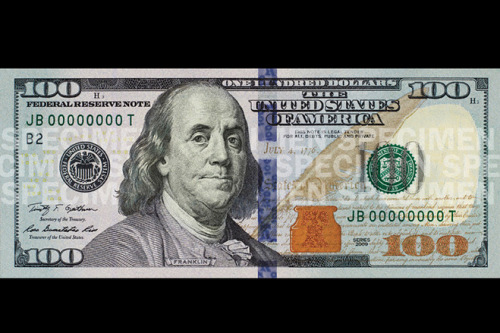 新版百元美钞将在生产延期两年后,于2013年10月8日发行。部分防伪措施包括在纸币中织入一条蓝色缎带和一个变色的自由钟。