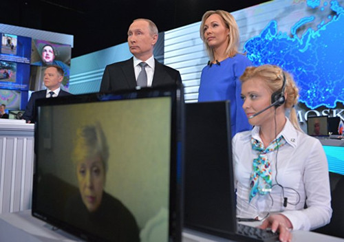 据俄媒报道,当地时间4月14日12时(北京时间17时),俄罗斯总统普京在莫斯科商栈展览中心与民众进行直播连线,回答民众感兴趣的社会、民生、内政、外交等问题。俄罗斯各大电视台和广播都对一年一度的 “与普京直接连线”节目进行了直播。此外,今年还将首次进行现场视频通话。