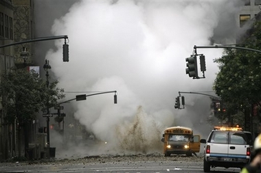 官员们说,黄昏时分,在中央车站附近的一条地下蒸气管道断裂,造成一条高耸的蒸气柱和烟雾,从地下喷出来的淤泥造成路面一片凌乱。事件发生后,地铁暂停服务,纽约市长布隆伯格到了41街附近的现场视察。此前有报道称,是变压器造成的此次爆炸事件。