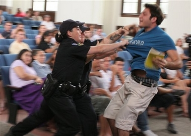 校警称,梅耶遭到电击是因为他抵挡警方行动,当时警方正试图将在论坛上闹事的他带出。(关新)