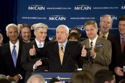 美国总统大选共和党参选人麦凯恩在获得弗吉尼亚州、马里兰州和华盛顿特区的初选胜利后,与支持者们一起欢呼。