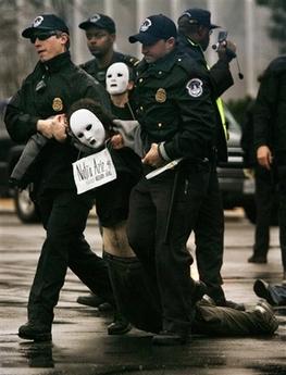 一名头戴面具,饰演阵亡美军士兵亡灵的反战人士被警察带走。