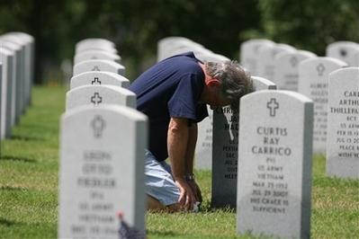 5月26日,一位父亲跪在阵亡儿子的墓碑前。
