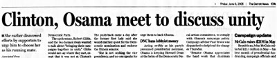 中新网6月8日电 美国前日出版的报章《底特律新闻》,约4.5万份报纸的17A页上,标题写错成《希拉里、奥萨玛会面商团结》(见图),把民主党总统选举准候选人奥巴马(Obama)的名字,错拼做“基地”恐怖组织领袖奥萨玛(Osama)•本•拉登。
