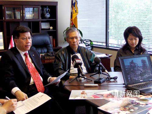 陈卓愉(左)一行从中国四川地震灾区赈灾归来后在温哥华召开记者会介绍所见所闻。