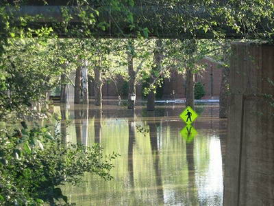爱荷华市的洪水水位仍在上升,图为该市大学艺术学院校园道路指示牌。