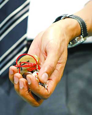 会上他向与会女性展示其随身携带的刻有十字架的护身符。