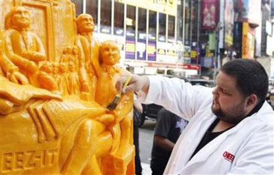 据路透社报道,7月4日,一位艺术家专门为美国独立日创作的乳酪雕刻在美国纽约时代广场上展出。这一新奇艺术品由重达一吨的乳酪制成,雕刻的内容是美国《独立宣言》签署时的情景。