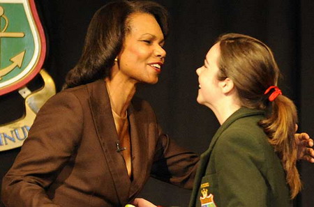 赖斯随后前往柏斯市历史第二悠久的中学访问,史密斯的女儿麦迪也在这所中学就读。该校的450名女孩子热烈欢迎了赖斯,并向她提出了问题。赖斯在学校大厅回答了女学生们提出了六七个问题,学生们在她回答问题后给予了热烈的掌声。作为学校的一个礼物,学校合唱团为赖斯演唱了《What a Wonderful Day》。赖斯对此表示感谢,她说:“这是我最喜爱的一首歌曲。”学校还向赖斯赠送了一本反映该校150年历史的书籍,她们在赖斯离开时全体起立欢呼。赖斯随后前往柏斯市西部的澳大利亚特别空勤团军营进行访问。