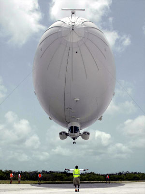 这艘用氦气填充的气艇Skyship 600,和波音747大小相当,花费160万美元租借,目前已抵达迈阿密西礁岛的海军基地,将用在佛罗里达海峡追踪运载毒品和非法移民的船只,进行为期6月的值勤测试。
