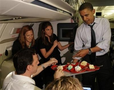 4日,奥巴马在飞机上向随行媒体人员派送生日蛋糕。