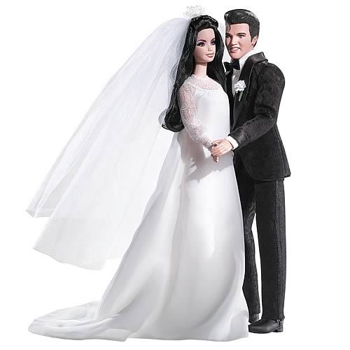 这个芭芭娃娃最新系列公仔的面部似足猫王和普丽西拉,造型来自两人过往多张结婚照片。新郎哥一身黑色西装打扮,打上领结;新娘子则披上一袭白色婚纱,配以同色长头紗。
