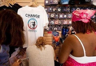当地一家书店正在热销一种印有“Om-Bama”字眼儿的瑜伽书籍,这一字眼儿是民主党号召选民深思的口号。而另外一家店主却在纽扣上大作文章,一种印着“我把黑人放在心中”的纽扣特别受欢迎。而最受欢迎的纽扣图案当数民主党副总统候选人拜登为16岁美女歌星迈莉·塞勒斯击鼓,而塞勒斯却依偎在奥巴马身边,后面还写着“青少年们的选择”字样。