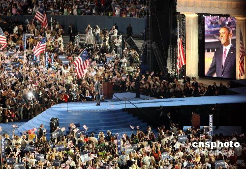 据“中央社”报道,奥巴马是在极度兴奋的七万五千名支持者面前接受民主党总统提名,成为有史以来获得主要政党提名的第一位黑人总统候选人。他获得提名的时间正逢马丁路德金博士发表呼吁种族和谐的演说《我有一个梦想》的四十五周年。