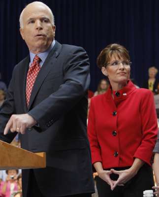 美国共和党副总统候选人佩林(右)被指可能拖累麦凯恩(左)的选情