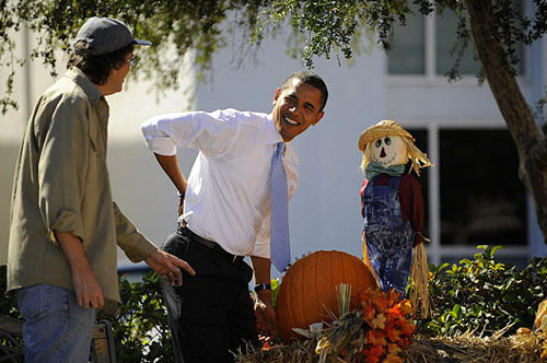 10月30日,在美国佛罗里达州的萨拉索塔,选战中四处奔走的美国民主党总统候选人奥巴马忙里偷闲,来到当地的一家南瓜园摘南瓜,享受片刻悠闲。