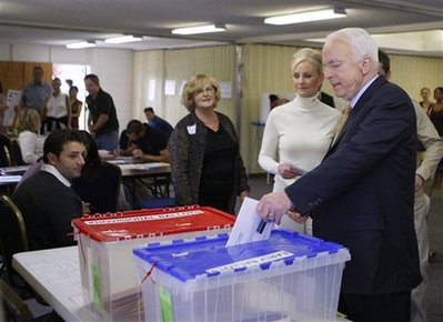 据报道,美国共和党总统候选人麦凯恩4日在妻子辛迪的陪同下在亚利桑那州进行了投票。随后麦凯恩计划前往邻近的科罗拉多州和新墨西哥州出席最后的竞选拉票集会,当日下午再返回凤凰城等候选举计票结果。