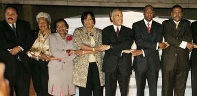 马丁路德金的家人们在大选日晚聚集在马丁路德金生前主礼的浸信会教堂前。