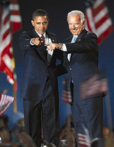 在芝加哥的庆祝大会上,奥巴马与副手拜登开心与支持者互动。