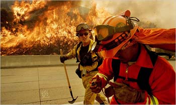 从圣巴巴拉(Santa Barbara)往东南方延烧到洛杉矶的大火,吞噬约8900公顷土地,当局下达至少5万次迁徙令。