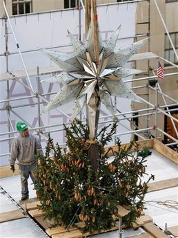 洛克菲勒中心管理处从(美东时间)星期二开始装饰圣诞树,除了树顶的星星采用施华洛世奇水晶外,整棵树还使用了数以千计的彩色小灯泡装饰,光华璀璨,令人难以逼视。