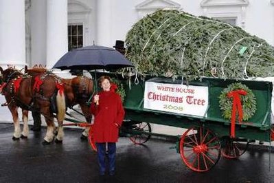 美国“第一夫人”劳拉30日在白宫门前冒雨迎接圣诞树,这已经是她第8次亦是最后一次以白宫主人身份主持简单的接受仪式。她的丈夫乔治-布什即将卸任总统,之后两人便会告别白宫。