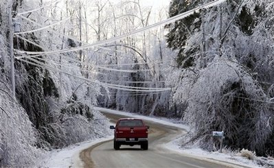 12月14日,缅因州,一辆卡车驶过两侧树木被冰覆盖的车道。
