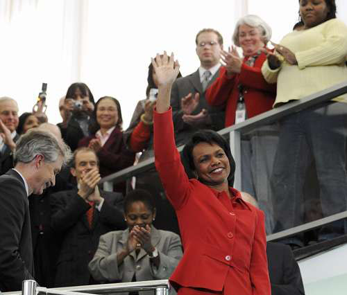 美国国务院十六日举行了一场告别会,国务院全体职员均有出席。会上国务卿赖斯发表了一段主题为保卫全球自由民主的重要性的简短演说。然后,她向下属们说:“你们永远都会留在我的脑海里、我的祷告里和我的心里。”当时她面露微笑,但眼里泛著泪光,而且说话的声音哽咽。语毕,台下向她报以热烈的欢呼和掌声,她则步下台阶,与各个大使、外交官、安全官员等逐一握手并拍照留念,然后步出大门。