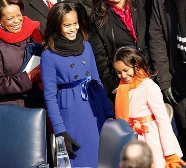 中新网1月22日电 美国总统奥巴马的长女马莉娅(10岁)和次女萨莎(7岁)20日在奥巴马就职仪式上的着装获得一致好评,被称“很可爱”,人气不亚于总统夫人米歇尔的礼服。据日本共同社报道,就职仪式后有关服装厂商接到蜂拥而至的问询,以致于网页爆满陷入瘫痪。