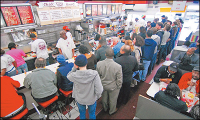 据《华盛顿时报》3月1日报道,U街是华盛顿最大的黑人社区,也是全美国历史最悠久的非洲裔社区。自从美国总统奥巴马和华盛顿市长阿德里安·芬蒂1月10日品尝了这里“班氏餐馆”的“半支香烟”(半截猪肉半截牛肉)热狗后,这里的热狗销量一下子增加了两倍,人们不得不排队等候。