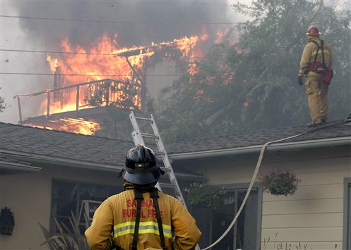 大量消防车和数架消防直升机在火区灭火,但火势难以控制。消防官员告诉当地电视台,房屋一间接着一间被大火吞噬,到傍晚时,至少有三十栋房屋被毁。据报道,至少两人被烧伤,另有两名消防员受伤。