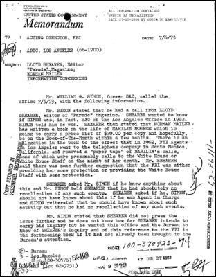 这些绝密文件记载,1973年夏天,美国犹太裔著名作家诺曼·梅勒刚刚出版了一本新书,其中披露FBI窃听的电话记录显示,1962年梦露死前曾给白宫打过电话。这本书还暗示着,梦露的死因与FBI有种种联系。一名专栏作家随后拨通了FBI洛杉矶办公室的电话,要求证实梅勒的质疑,此事让联邦调查局异常恼火。
