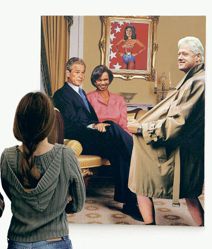其中,题为《Return of a donkey》的画中出现了美国共和党总统布什、国务卿赖斯、美国民主党前总统克林顿和前白宫见习生莱温斯基。滑稽的是,克林顿被恶搞成了露体狂的样子。而“donkey”的双关语则既指傻瓜又象征美国民主党。